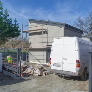 Pogoda jeszcze nie rozpieszcza ale wykorzystujemy każdy cieplejszy dzień. Na zewnątrz domków powstają elewacje oraz ogrodzenia, montowane są systemy bezpieczeństwa. Wewnątrz równolegle trwa meblowanie, podłączanie mediów oraz biały montaż.