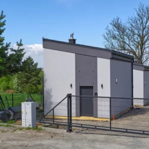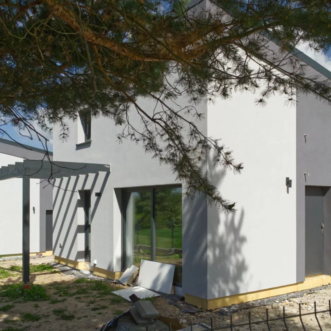 Słoneczna i ciepła majowa pogoda pozwoliła nam na prace nad elewacjami obu domków. Montaż ogrodzenia, bramy oraz automatyki także na ukończeniu.